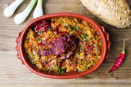 Dish of cabbage and meat served on rustic bowl