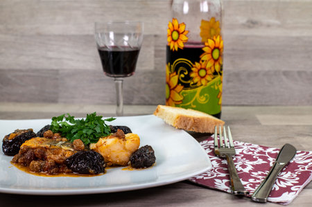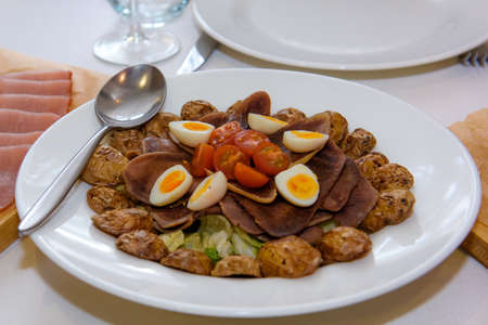 Close-up view of traditional Catalan cuisine dish in cafe restaurant bar - potatoes and chicken meat with pepper vegetables