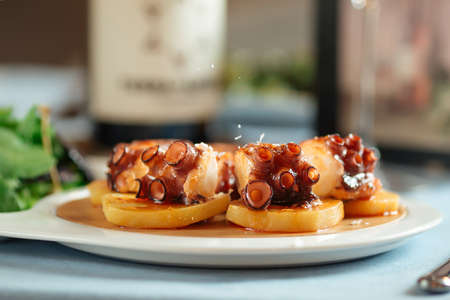 Typical spanish octopus food and dishes served in a restaurant