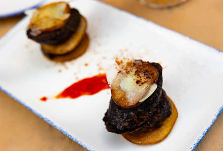 Spanish timbale of morcilla with caramelized pears and cheese