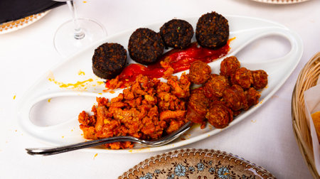 ccccccRestaurant table with food Ropa Vieja stew with chickpea, octopus salade and sauces. Typical dish from the Canary Islands