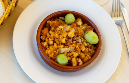Plate with typical spanish dish migas pastoriles. Spanish cuisine