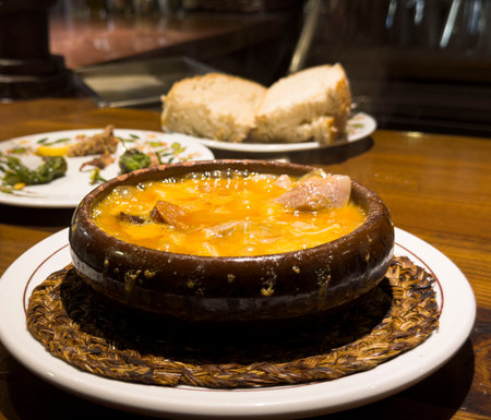 Dinner at guachinche, typical Canary Island establishment on Tenerife, where locally produced white or red wine served accompanied by homemade traditional food in sunny day, vegetable soup with gofio