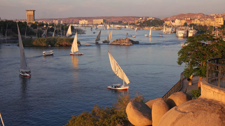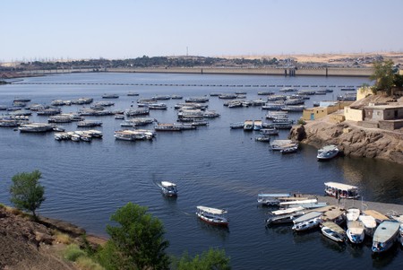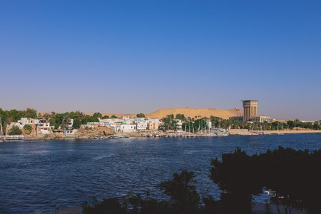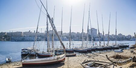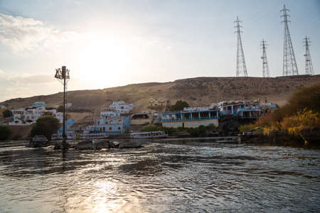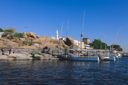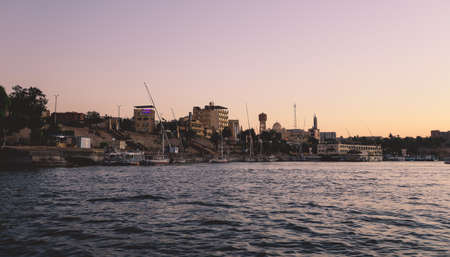 Aswan city, beautiful scenery of the Nile and boats, upper Egypt.