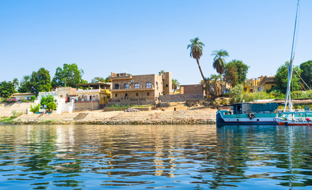 waterside River Nile scenery including two sailing ships between Aswan and Luxor in Egypt (Africa)