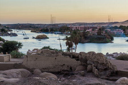 Old ruins at the Elephantine island and river Nile in Aswan, Egypt