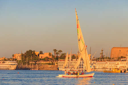 Luxor, Egypt - December 11, 2018: Felucca boats sailing on the Nile river in Luxor, Egypt. Traditional Egyptian sailing boats
