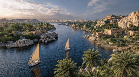 Aswan, Egypt showcasing a harmonious fusion of ancient heritage, serene nile reflections, and lively market energy amid sunlit desert backdrops, perfect for travel, tourism, and cultural storytelling.
