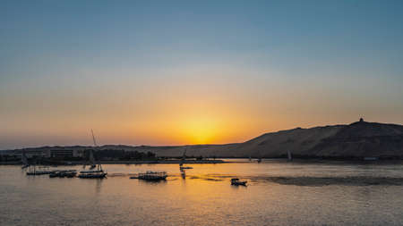 Sailboats of the Nile, beautiful sunset over Aswan city, Egypt.