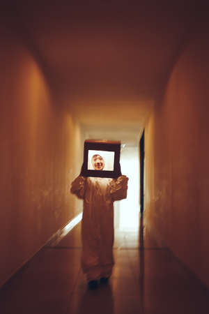 Horror ghost man behind the matte glass. Halloween festival concept.