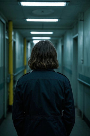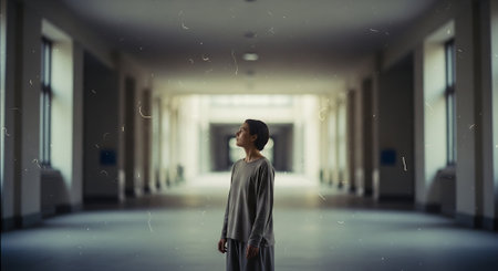 A solitary figure stands at the end of a long, dim corridor with peeling paint, illuminated by a single window. The atmospheric image evokes themes of loneliness, mystery, or institutional settings.