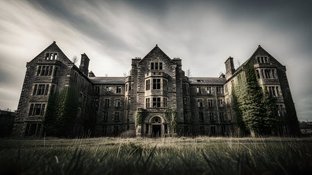 The image depicts an abandoned Gothic-style mansion, characterized by its tall, pointed arches and intricate stonework. The building appears to be in a state of disrepair, with ivy and other vegetation covering parts of the walls. The sky is overcast, adding to the eerie and desolate atmosphere of the scene. The mansion stands alone in an open field, emphasizing its isolation.