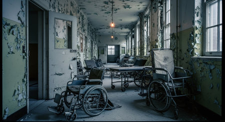An abandoned hospital corridor with peeling paint, empty wheelchairs, and dim lighting