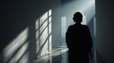 Woman walking towards light in empty room with window shadows
