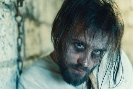 Horror For Halloween Holiday Crazy Man In A Dirty Measuring Shirt In An Old Ruined House Is Locked And Scares Everyone Surrounding Expecting A Victim
