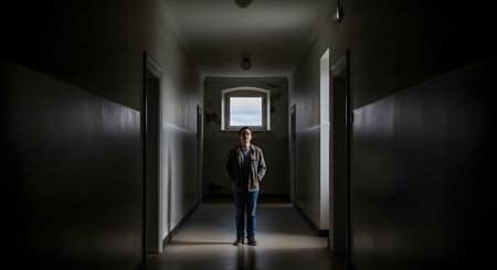 A lone man stands in the center of a long, dark hallway, silhouetted against a bright window at the far end. The moody and symmetrical composition conveys themes of solitude, contemplation, and waiting.