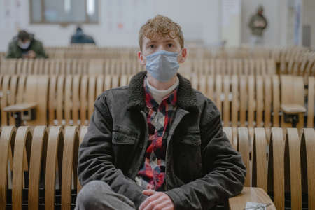 a young man sits at the station waiting for his train, with a mask on his face, curly hair, movement during a pandemic