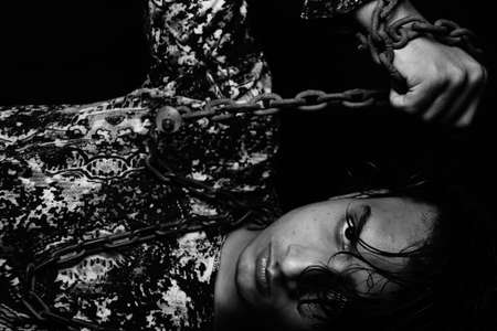 Slave girl in cage. Imprisonment, Female prisoner, Women violence and abused concept, human trafficking Concept, international women's day.