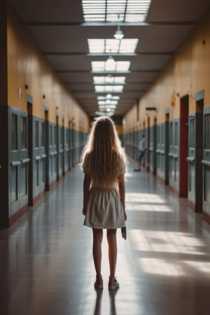 Rear view of female student who was walking alone in corridor of school building.