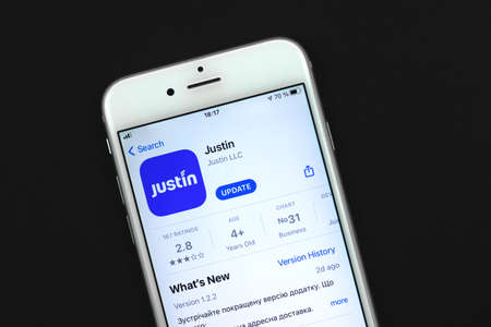 Kharkov, Ukraine - February 22, 2021: Justin shipping applicatiton on Apple iPhone screen, Ukrainian postal app photo