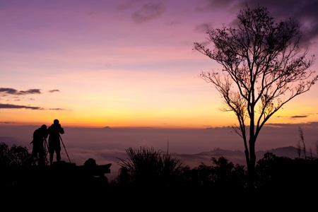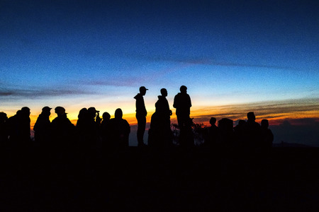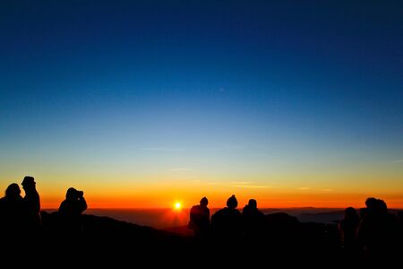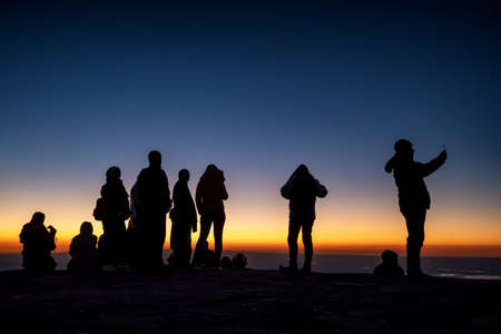 Silhouette of unidentified people at the top of mountain waiting for sunrise