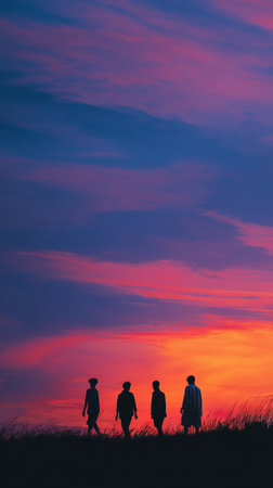 Four friends walk along a silhouette against a colorful sunset sky in a serene landscape