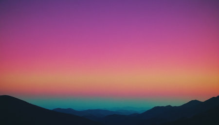 A tranquil sunrise paints the sky in soft gradients of purple, orange, and yellow above misty, silhouetted rolling...