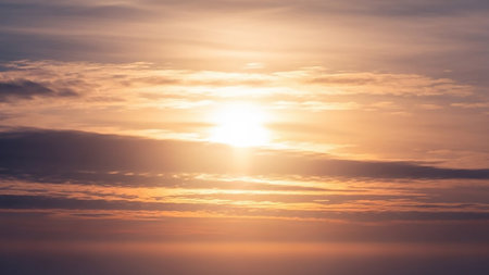 Cloudy sky at sunset or sunrise with bright sun. Abstract background for design.