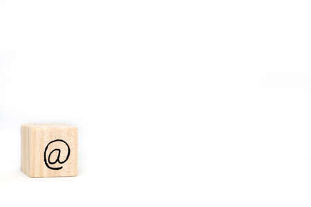 Wooden cube with a commercial At Sign symbol isolated on white background, space for text