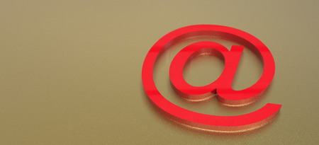 The glass symbol @ is under a beam of light, located on a golden background. 3D image of the symbol At. 3D rendering.