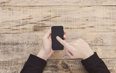 Close-up image of male hands using smartphone searching or social networks concept, hipster man typing an sms message to his friends on vintage wood table in cafe