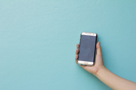 Bangkok, Thailand October 24, 2016 : Woman held android phone Samsung galaxy S7 Edge on blue concrete background.