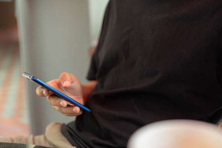 Young man using smartphone. Hand holding mobile texting message contact us.chatting,search internet information. Technology device communication connecting.