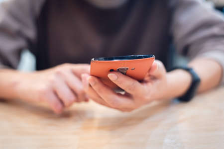 Womanhand using smartphone to do work business, social network, communication in public cafe work space area.