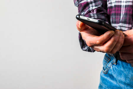 Mock-up technology. Man holds a smartphone in his hands close-up