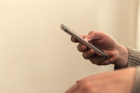 Closeup of female hands using smartphone for communication in living room, selective focus