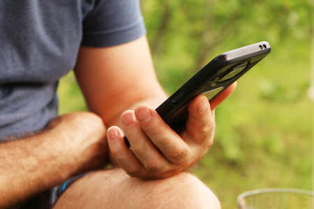 Businessman on vacation holding a smartphone, on a green summer day. Man in a blue shirt texting on an external phone.