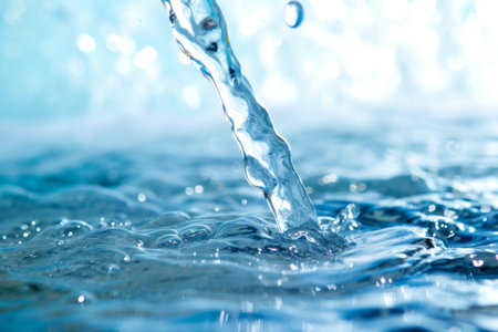 Close-up of water droplets splashing in a pool of blue water, capturing the freshness and purity of the liquid.