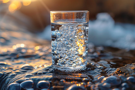 A crystal clear glass of water placed on a wooden surface showcases bubbles rising in a serene setting by the sea.