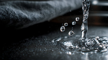 Water streams gracefully from a tap, creating a captivating display of sparkling droplets with blurred reflections dancing on a serene surface, evoking tranquility.