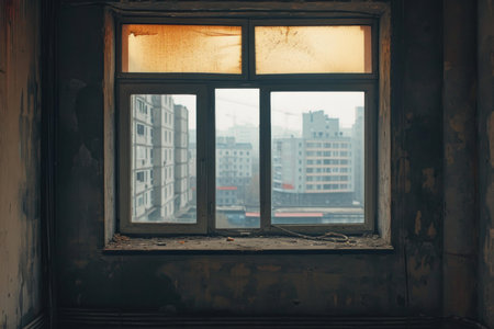 Sunlight streams through dusty window, illuminating glass panes and creating warm, inviting atmosphere. play of light and shadow adds depth to scene, evoking sense of tranquility and nostalgia