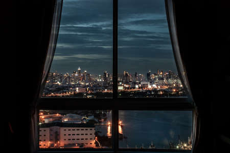 The beautiful view of Bangkok, the beautiful skyscrapers along the Chao Phraya River during sunset seen through a bedroom window.