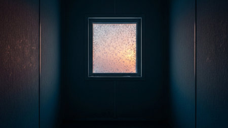 A captivating view of a frosted window pane, showcasing delicate ice crystals and a cool, serene atmosphere that evokes feelings of winter tranquility.