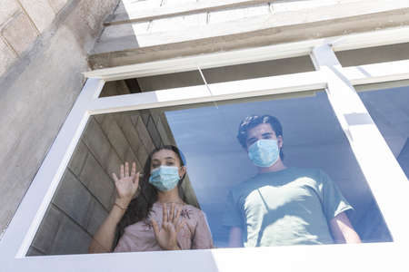Man and woman in quarantine with face masks looking out of their house through the window.