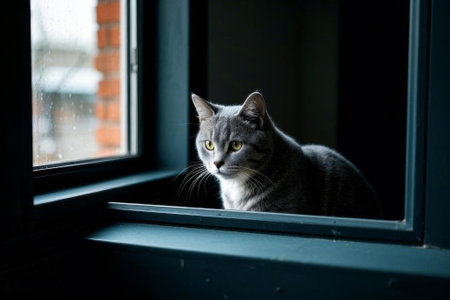 A man sits in a dimly lit room, staring pensively out a window as raindrops trickle down the glass. His expression shows deep reflection during a quiet afternoon.