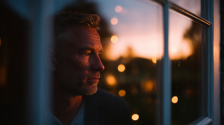 dramatic portrait of attractive sad and depressed mid adult man looking through home window feeling worried and desperate suffering depression problem thoughtful in pain