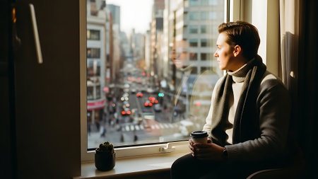 Man leaning against a window pane, cloudy sky and gentle rain outside, holding a cup generative ai