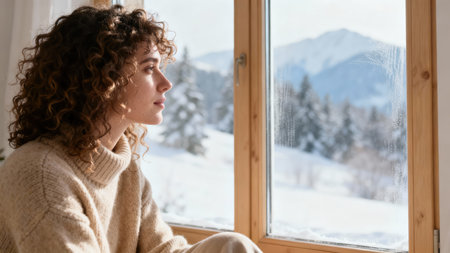Close profile of a young adult woman in a thick beige knit turtleneck, illuminated by warm sunlight, gazing thoughtfully at a wooden window revealing a snowy mountain and forest vista.