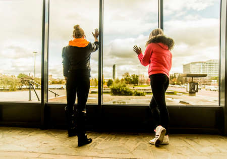 Silhouette of many friend taking photos at high floor of skyscraper neat huge panoramic windows with the view of the city.