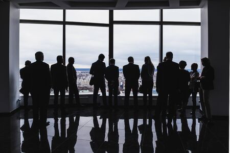 Group of business people standing in front of wide panaramic office windows. Silhouettes of different groups of businesspeople talking with each other in skyscraper office interior